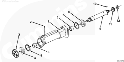 1驅(qū)動殼體,2直螺紋 O 形圈螺塞 (3),3螺母,4止推板(小內(nèi)徑),5止推軸承,6襯套 (2),7止推軸承,8止推板(大內(nèi)徑),9傳動軸,10半圓鍵(參考注釋),11花鍵接頭,12螺母。