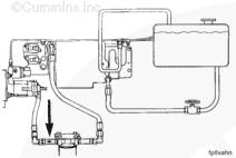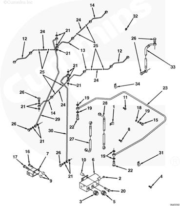 1左排歧管(零件號(hào) 3094772),2流至 EHAB 進(jìn)口(左排供油)的燃油(抽吸未經(jīng)過(guò)濾的燃油),3流至右排燃油歧管(右排供油)的燃油(抽吸未經(jīng)過(guò)濾的燃油),4自油箱/粗濾器的供油(抽吸未經(jīng)過(guò)濾的燃油),5自右排燃油歧管(右排回油)流入的燃油,6流至供油箱的燃油(回油),7自左排 EHAB/噴油泵溢流管和噴油器回油管(兩條管路)的回油。