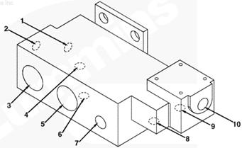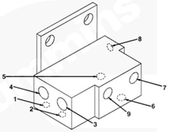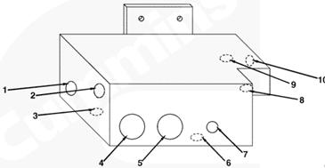 1右排歧管(零件號(hào) 3094906),2流至 EHAB 進(jìn)口的燃油(抽吸未經(jīng)過(guò)濾的燃油),3自右排噴油器回油管和噴油泵溢流管/EHAB(兩條管路)的回油,4自左排燃油歧管(右排供油)的燃油(抽吸未經(jīng)過(guò)濾的燃油),5流至左排燃油歧管(自右排回油)的燃油,6自濾清器和左排燃油歧管的燃油(經(jīng)過(guò)濾的增壓燃油),7流至左排燃油歧管(未經(jīng)過(guò)濾的增壓燃油)和濾清器的燃油,8自輸油泵的燃油(未經(jīng)過(guò)濾的增壓燃油),9流至噴油泵進(jìn)口/EHAB 的燃油(經(jīng)過(guò)濾的增壓燃油)。