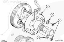 注: 凸輪軸齒輪上的圓形孔必須在 1:00 和 7:00 位置對(duì)齊,以插入拆卸器爪總成。