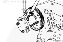 注: 確保座圈法蘭的平面緊靠凸輪軸齒輪轂的輻條。這將使拆卸器爪恰好位于凸輪軸齒輪的背面。