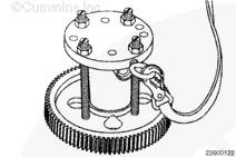 將吊環(huán)螺栓安裝進(jìn)拆卸墊板。將提升設(shè)備固定在吊環(huán)螺栓上。如有必要,輕輕提升凸輪軸齒輪拆卸器組件,將該組件與凸輪軸對(duì)齊。