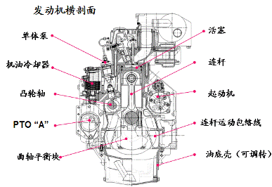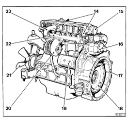 14 升降點(diǎn),15曲軸箱呼吸閥,16 調(diào)速器,17 SAE護(hù)蓋,18調(diào)速輪,19 啟動馬達(dá),20 廢氣渦輪增壓器,21鼓風(fēng)機(jī),22 排氣總管,23進(jìn)氣口總管,