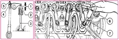 調(diào)整氣門間隙之前,停機(jī)30分鐘,油溫要低于80℃。用塞尺6檢查2、3之間的間隙1,塞尺塞入后要有輕度 磨擦,正確的氣門間隙;進(jìn)氣門:0.3mm,排氣門:0.5mm,(每次更換氣缸墊后,氣門間隙增加0.1mm,運(yùn)轉(zhuǎn) 50-150小時(shí)后重新調(diào)整)。按如下步驟調(diào)整氣門間隙: -松開鎖母4。用改錐7擰螺栓5,上緊鎖母4,得到正確的氣門間隙。 檢查、調(diào)查其他各缸的氣門間隙。裝好氣門室蓋(如需要,更換墊圈)。