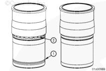通過康明斯ISX15 CM2250發(fā)動機(jī)缸套下部外徑上加工出的條帶 (1) 可以輕易識別出工廠墊片調(diào)整缸套。安裝缸套后,同樣可以看到此條帶。這些缸套在中間限位座合區(qū)域還包含有固定式硬化黃銅墊片 (2)。