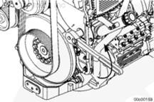 使用壓縮機驅(qū)動裝置或盤車裝置沿發(fā)動機旋轉(zhuǎn)方向順時針(從發(fā)動機前方看)盤動發(fā)動機。將減振器上的 A 標記與齒輪室蓋上的指示箭頭對齊。