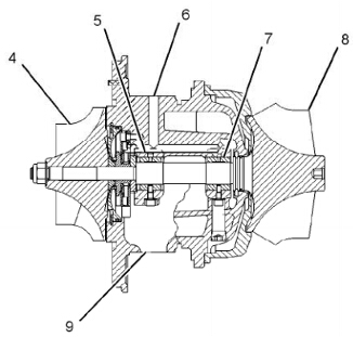 渦輪增壓器中的軸承(5)和軸承(7)使用發(fā)動機機油進(jìn)行壓力潤滑。機油經(jīng)由進(jìn)油管被輸送到上部的進(jìn)油口(6)。機油繼而經(jīng)由中段內(nèi)的油遁潤荷軸承。機油從底部的出油口(9)流出。然后機油通過回油管流回曲軸箱。