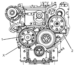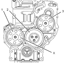 5將工具(B)穿過Perkins1106A/C發(fā)動(dòng)機(jī)凸輪軸齒輪(1)的孔(X)安裝到前Perkins1106A/C發(fā)動(dòng)機(jī)機(jī)殼體中。
