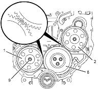 6安裝Perkins1106A/C發(fā)動(dòng)機(jī)惰齒輪(8)。確保齒輪(1)和齒輪(8)上的正時(shí)標(biāo)記已對(duì)準(zhǔn)。確保齒輪正確嚙合。擰緊Perkins1106A/C發(fā)動(dòng)機(jī)惰齒輪(8)的螺栓至扭矩為44N·m(32lbft)。請(qǐng)參閱《Perkins1106A/C發(fā)動(dòng)機(jī)拆解和組裝》,“Perkins1106A/C發(fā)動(dòng)機(jī)惰齒輪-拆卸和安裝”以了解正確程序。