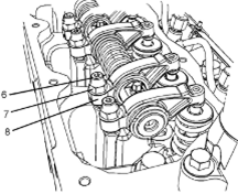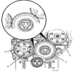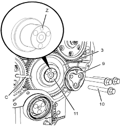 Perkins1106A/C發(fā)動(dòng)機(jī)惰齒輪-拆卸 拆卸步驟 Perkins1106A/C發(fā)動(dòng)機(jī)曲軸轉(zhuǎn)動(dòng)工具用于前皮帶輪。 該工具在電動(dòng)起動(dòng)馬達(dá)的孔上使用。 開(kāi)始: a.拆卸Perkins1106A/C發(fā)動(dòng)機(jī)噴油泵齒輪。請(qǐng)參閱《Perkins1106A/C發(fā)動(dòng)機(jī)拆解和組裝》,“Perkins1106A/C發(fā)動(dòng)機(jī)燃油泵齒輪-拆卸”。 b.拆下Perkins1106A/C發(fā)動(dòng)機(jī)氣門機(jī)構(gòu)蓋。請(qǐng)參閱《Perkins1106A/C發(fā)動(dòng)機(jī)拆解和組裝》,“Perkins1106A/C發(fā)動(dòng)機(jī)氣門機(jī)構(gòu)蓋-拆卸和安裝”。 注:可以使用兩個(gè)工具(A)中的任意一個(gè)。請(qǐng)使用最適用的工具。 注:必須小心操作,確保在Perkins1106A/C發(fā)動(dòng)機(jī)燃油泵齒輪的拆卸過(guò)程 注意:保持所有零件清潔無(wú)雜質(zhì)。雜質(zhì)會(huì)造成快速磨損和縮短部件壽命。 1從Perkins1106A/C發(fā)動(dòng)機(jī)缸體上拆下螺塞(5)。從螺塞(5)拆下O形密封圈(4)。 2使用工具(A)轉(zhuǎn)動(dòng)Perkins1106A/C發(fā)動(dòng)機(jī)曲軸,使1號(hào)Perkins1106A/C發(fā)動(dòng)機(jī)活塞處于其壓縮沖程的上止點(diǎn)位置。請(qǐng)參閱《系統(tǒng)操作、測(cè)試和調(diào)整》,“查找1號(hào)Perkins1106A/C發(fā)動(dòng)機(jī)活塞上止點(diǎn)位置”。 3將工具(B)安裝到Perkins1106A/C發(fā)動(dòng)機(jī)缸體的孔(Y)中。使用工具(B),將Perkins1106A/C發(fā)動(dòng)機(jī)曲軸鎖定到位。 注:安裝工具(B)時(shí)不要使用過(guò)大的力量。在修理過(guò)程中不要使用工具(B)固定Perkins1106A/C發(fā)動(dòng)機(jī)曲軸。 4.確保已將工具(C)安裝在Perkins1106A/C發(fā)動(dòng)機(jī)凸輪軸齒輪的孔(X)中。使用工具(C)將Perkins1106A/C發(fā)動(dòng)機(jī)凸輪軸鎖定到位。 5.確保已標(biāo)記齒輪(1)、(2)和(3)以便顯示對(duì)準(zhǔn)位置。 6松開(kāi)所有搖臂(8)上的螺母(7)。擰松所有搖臂(8)上的調(diào)節(jié)器(6),直到所有氣門完全閉合。 注:如果不能保證完全擰松所有調(diào)節(jié)器,可能會(huì)導(dǎo)致氣門與Perkins1106A/C發(fā)動(dòng)機(jī)活塞接觸。 7.標(biāo)記板(9)以顯示朝向。 注:識(shí)別標(biāo)記能確保將板安裝在原來(lái)的對(duì)準(zhǔn)位置。 8.拆下螺栓(10)。 9.拆下板(9)。 10.將Perkins1106A/C發(fā)動(dòng)機(jī)惰齒輪組件(3)和輪轂(11)從前Perkins1106A/C發(fā)動(dòng)機(jī)機(jī)殼體的凹槽上卸下。 注:在拆卸過(guò)程中必須傾斜Perkins1106A/C發(fā)動(dòng)機(jī)惰齒輪。 11.將輪轂(11)從Perkins1106A/C發(fā)動(dòng)機(jī)惰齒輪(3)上卸下。 Perkins1106A/C發(fā)動(dòng)機(jī)惰齒輪-安裝 安裝步驟 Perkins1106A/C發(fā)動(dòng)機(jī)曲軸轉(zhuǎn)動(dòng)工具用于前皮帶輪。 該工具在電動(dòng)起動(dòng)馬達(dá)的孔上使用。 1如有必要,使用工具(A)確保1號(hào)Perkins1106A/C發(fā)動(dòng)機(jī)活塞處于壓縮行程上止點(diǎn)。有關(guān)正確的步驟,請(qǐng)參閱《系統(tǒng)操作、測(cè)試和調(diào)整》,“查找1號(hào)Perkins1106A/C發(fā)動(dòng)機(jī)活塞上止點(diǎn)位置”。 2確保已將工具(B)安裝在Perkins1106A/C發(fā)動(dòng)機(jī)缸體的孔(Y)中。使用工具(B),將Perkins1106A/C發(fā)動(dòng)機(jī)曲軸鎖定到位。 3.確保已將工具(C)安裝在Perkins1106A/C發(fā)動(dòng)機(jī)凸輪軸齒輪(1)的孔(X)中。 4清潔Perkins1106A/C發(fā)動(dòng)機(jī)惰齒輪(3),檢查Perkins1106A/C發(fā)動(dòng)機(jī)惰齒輪有無(wú)磨損或損壞。有關(guān)更多資料,請(qǐng)參閱《技術(shù)規(guī)格》,“齒輪總成(前)”。如有必要,更換Perkins1106A/C發(fā)動(dòng)機(jī)惰齒輪。 5清潔輪轂(11),檢查輪轂有無(wú)磨損或損壞。有關(guān)更多資料,請(qǐng)參閱《技術(shù)規(guī)格》,“齒輪總成(前)”。如有必要,更換輪轂。 6使用清潔的發(fā)動(dòng)機(jī)Perkins1106A/C發(fā)動(dòng)機(jī)機(jī)油潤(rùn)滑輪轂(11)。將輪轂(11)滑入Perkins1106A/C發(fā)動(dòng)機(jī)惰齒輪(3)。確保正時(shí)標(biāo)記朝向Perkins1106A/C發(fā)動(dòng)機(jī)惰齒輪前部。 7對(duì)準(zhǔn)Perkins1106A/C發(fā)動(dòng)機(jī)惰齒輪(3)與Perkins1106A/C發(fā)動(dòng)機(jī)凸輪軸齒輪上的的正時(shí)標(biāo)記。請(qǐng)參閱插圖135。將Perkins1106A/C發(fā)動(dòng)機(jī)惰齒輪組件(3)和輪轂(11)安裝到正時(shí)箱的凹槽中。確保油孔(Z)靠近輪轂頂部。 注:在安裝過(guò)程中必須傾斜Perkins1106A/C發(fā)動(dòng)機(jī)惰齒輪。確保對(duì)準(zhǔn)輪轂中的孔與Perkins1106A/C發(fā)動(dòng)機(jī)缸體中的孔。 8.清潔板(9),檢查板有無(wú)磨損或損壞。如有必要,更換板。 9.使用清潔的發(fā)動(dòng)機(jī)機(jī)油潤(rùn)滑板(9)。對(duì)準(zhǔn)板(9)和輪轂(11)內(nèi)的孔。將板安裝在原來(lái)的朝向。 10.安裝螺栓(10)。 11.拆下工具(B)和工具(C)。 注:拆下工具(B)和工具(C)之前,確保正時(shí)標(biāo)記已對(duì)齊。 12.擰緊螺栓(10)至扭矩為44N·m(32lbft)。 13.使用工具(D)測(cè)量Perkins1106A/C發(fā)動(dòng)機(jī)凸輪軸齒輪的端隙。有關(guān)更多資料,請(qǐng)參閱《技術(shù)規(guī)格》,“齒輪總成(前)”。 14.使用工具(D)測(cè)量Perkins1106A/C發(fā)動(dòng)機(jī)惰齒輪與Perkins1106A/C發(fā)動(dòng)機(jī)凸輪軸齒輪之間的齒隙。有關(guān)更多資料,請(qǐng)參閱《技術(shù)規(guī)格》,“齒輪總成(前)”。 15.使用工具(D)測(cè)量Perkins1