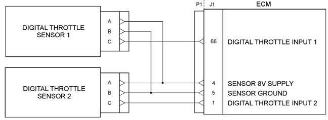 數(shù)字節(jié)氣門位置傳感器由+8VDC從ECM。電源電壓來自的j1:4終端”一個(gè)“數(shù)字油門位置傳感器連接器。