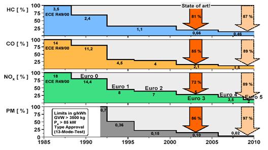 2 、為滿足排放法規(guī)所采用的技術(shù) 歐洲1號(hào)和2號(hào)標(biāo)準(zhǔn):使用機(jī)械控制噴油系統(tǒng)即可達(dá)標(biāo)。歐洲3號(hào)標(biāo)準(zhǔn):必須使用電子控制噴油系統(tǒng)。共軌式系統(tǒng)、電控單體泵,電控泵噴嘴系統(tǒng),蓄壓增壓電噴系統(tǒng)(HEUI)和直列泵分配泵電控系統(tǒng)能夠滿足這個(gè)標(biāo)準(zhǔn)。