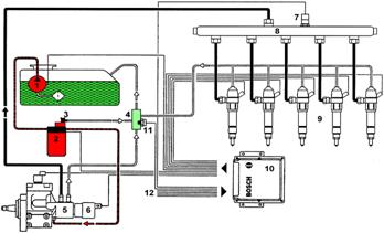 1=電動(dòng)輸油泵2=燃油濾清器3=回油閥4=回油儲(chǔ)存器5=CP1 高壓泵6=高壓控制閥7=共管壓力傳感器 (RPS)8=共管