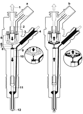 噴油器可以被拆分為一系列功能部件:孔式噴油嘴,液壓伺服系統(tǒng)和電磁閥。燃油來(lái)自于高壓油路,經(jīng)通道流向噴油嘴,同時(shí)經(jīng)節(jié)流孔流向控制腔,控制腔與燃油回路相連,途徑一個(gè)受電磁閥控制其開(kāi)關(guān)的泄油孔。泄油孔關(guān)閉時(shí),作用于針閥控制活塞的液壓力超過(guò)了它在噴油嘴針閥承壓面的力,結(jié)果,針閥被迫進(jìn)入閥座且將高壓通道與燃燒室隔離,密封。
