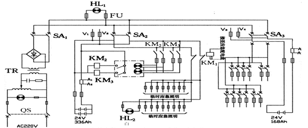 在每一個充電回路應(yīng)設(shè)有防止逆流的逆電流繼電器或二極管,當主應(yīng)急電網(wǎng)都失電時,接觸器ZC1線圈失電,常閉觸頭閉合,直接向小應(yīng)急用電設(shè)備供電,其余用電設(shè)備分別利用開關(guān)送電。