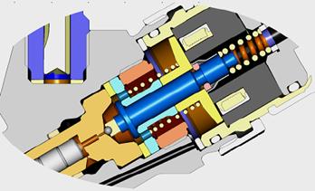 當(dāng)噴油器的電磁閥被觸發(fā),泄油孔被打開(kāi),這引起控制腔的壓力下降,結(jié)果,活塞上的液壓力也隨之下降,一旦液壓力降至低于作用于噴油嘴針閥承壓面上的力,針閥被打開(kāi),燃油經(jīng)噴孔噴入燃燒室。這種對(duì)噴油嘴針閥的不直接控制采用了一套液壓力放大系統(tǒng),因?yàn)榭焖俅蜷_(kāi)針閥所需的力不能直接由電磁閥產(chǎn)生,所謂的打開(kāi)針閥所需的控制作用,是通過(guò)電磁閥打開(kāi)泄油孔使得控制腔壓力降低,從而打開(kāi)針閥。